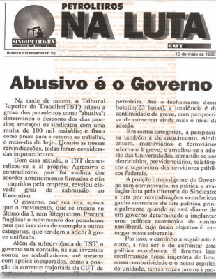 No sétimo dia de greve, apesar da legitimidade das reivindicações da categoria, que exigia o cumprimento de acordos pactuados em 1994, o Tribunal Superior do Trabalho desmoralizou-se e julgou a greve abusiva. Também determinou o desconto dos dias parados; ameaçou os sindicatos com uma multa de R$ 100 mil/dia; e fixou como prazo de retorno ao trabalho o meio-dia de 10 de maio. Tudo isso, mesmo com o TST sendo o avalista dos acordos anteriormente firmados e não cumpridos. A categoria, porém, não se intimidou. Em manchete, o boletim do SINDIPETRO-RN estampou: Abusivo é o Governo!
