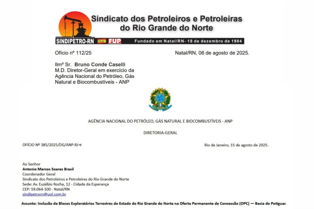 A medida chega em um momento estratégico para a indústria do petróleo no Rio Grande do Norte, que enfrenta o declínio natural de seus campos maduros. Para o SINDIPETRO-RN, a entrada de novos blocos garante a continuidade da atividade produtiva, fortalece a permanência das empresas no estado e preserva a cadeia de fornecedores e prestadores de serviços. “Se não houver novos blocos sendo ofertados, corre-se o risco de uma retração econômica grave, porque o setor representa parcela significativa do PIB industrial do RN”, alertou Brasil.