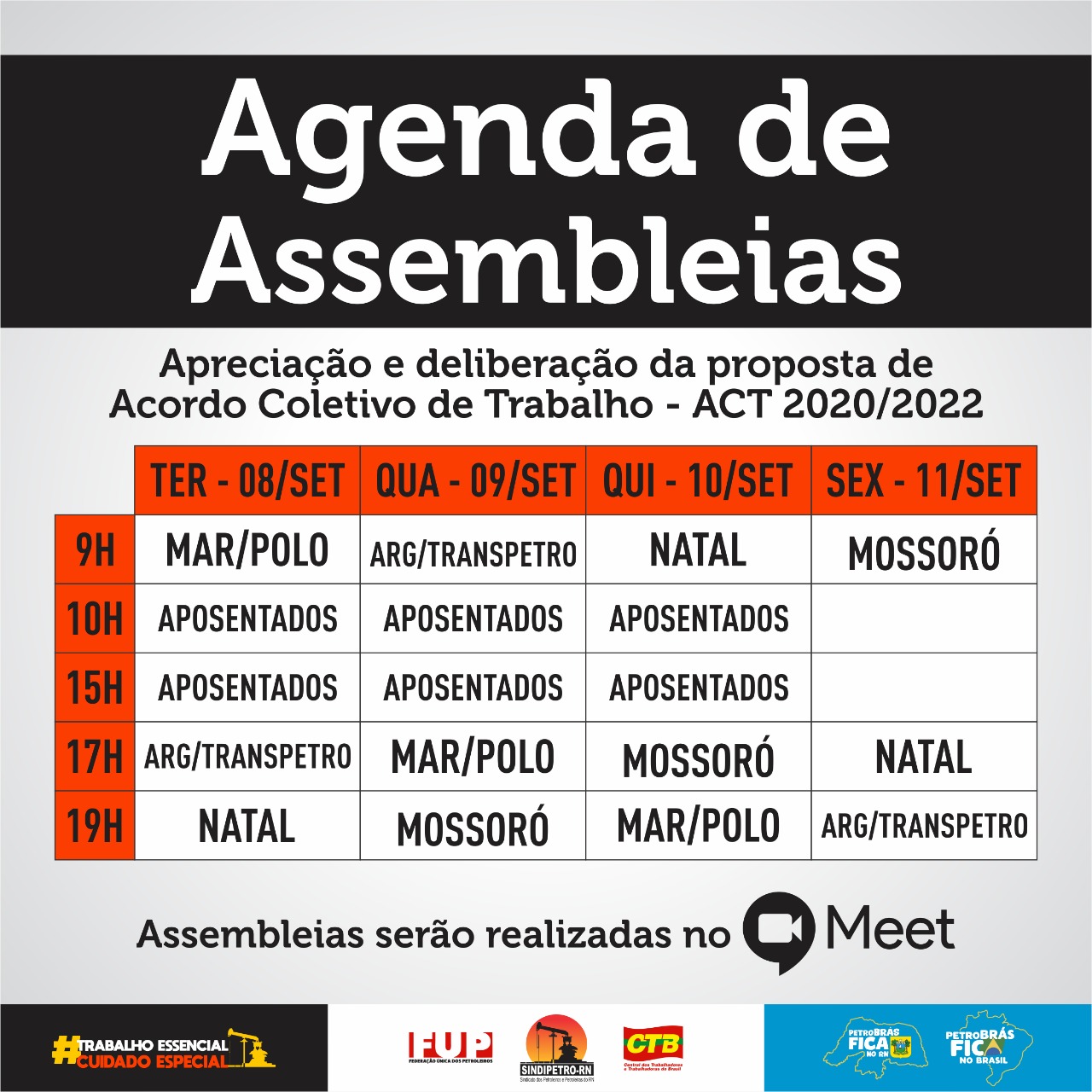 A diretoria do SINDIPETRO-RN informa que de 8 a 13 de setembro, serão realizadas as assembleias deliberativas extraordinárias do Acordo Coletivo de Trabalho – 2020/2022 da Petrobrás. O pleito será definido de forma virtual pela plataforma digital Google Meet. O Conselho Deliberativo da FUP e Sindicatos indicam a aceitação da última contraproposta apresentada pela gestão do Sistema Petrobrás.