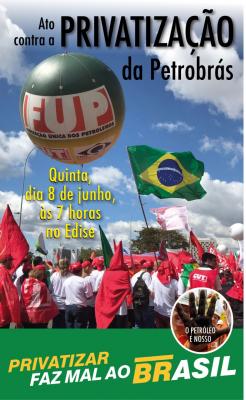 Para unificar forças nessa luta, a FUP e seus sindicatos filiados realizam um importante ato político nesta quinta-feira, 08 de junho, em frente à sede da Petrobrás, no Rio de Janeiro, contra a privatização da empresa. Convocamos os trabalhadores, estudantes, movimentos sociais, lideranças políticas e todas as frentes populares de luta para se somarem a essa mobilização em defesa da soberania nacional. Não vamos deixar que destruam a mais importante estatal brasileira.