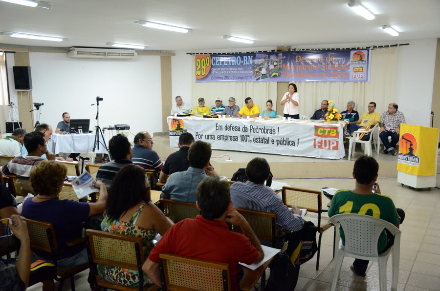 Construir a unidade de ação do movimento sindical petroleiro e fazer o País avançar no rumo de novas conquistas. Estes foram os temas predominantes nas intervenções dos participantes do Ato Político de abertura do 29º Congresso Estadual dos Petroleiros e Petroleiras do Rio Grande do Norte – CEPETRO-RN, realizado neste sábado, 31. Além dos diretores do SINDIPETRO-RN, José Araújo, Fátima Viana, Manoel Assunção e Claudionor Arruda, e do diretor da Federação Única dos Petroleiros, Divanilton Pereira, dirigiram-se aos delegados os vereadores natalenses George Câmara (PCdoB) e Marcos Antonio (PSOL), a deputada federal Fátima Bezerra (PT), o petroleiro Belchior Medeiros, representando o PSTU, e os dirigentes das centrais sindicais Moacir Soares (CTB) e Alfredo Neves (CUT). O 29º CEPETRO-RN acontece no Centro de Formação de Educadores Maristas, em Extremoz, município da Região Metropolitana de Natal, reunindo trabalhadores e trabalhadoras dos setores público e privado, aposentados, aposentadas e pensionistas.