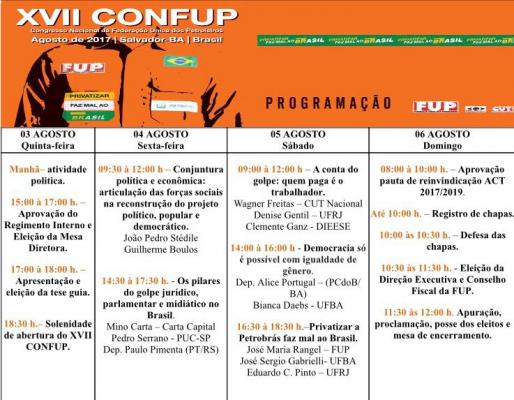 O Congresso Nacional da FUP também elegerá a nova diretoria da entidade para o triênio 2017-2020. O evento será realizado no Hotel Fiesta, no bairro Pituba. Conheça a programação completa: