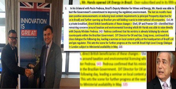 Um documento oficial da chancelaria britânica revela como o governo brasileiro, que assumiu o poder após o golpe de 2016, passou a servir aos interesses das multinacionais do petróleo – em especial, da Shell; no memorando, o ministro de Comércio Greg Hands relata como o secretário-executivo do Ministério de Minas e Energia, Paulo Pedrosa, estaria fazendo lobby no governo brasileiro para servir à Shell, que teve todos os seus pedidos atendidos: menos impostos, menos conteúdo nacional e menos exigências ambientais.