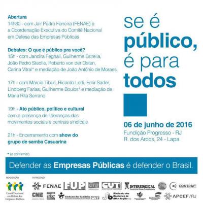 Defender e valorizar as empresas e serviços públicos do país, que estão sob ataque no Congresso Nacional. Esse é o intuito da campanha “Se é público, é para todos”, que será lançada nesta segunda-feira, 06, a partir das 14h30, na Fundição Progresso do Rio de Janeiro. O evento é promovido pelo Comitê Nacional em Defesa das Empresas Públicas, cujo objetivo é barrar projetos de lei que visam desmontar e privatizar o Estado brasileiro, com o apoio do governo interino de Michel Temer.