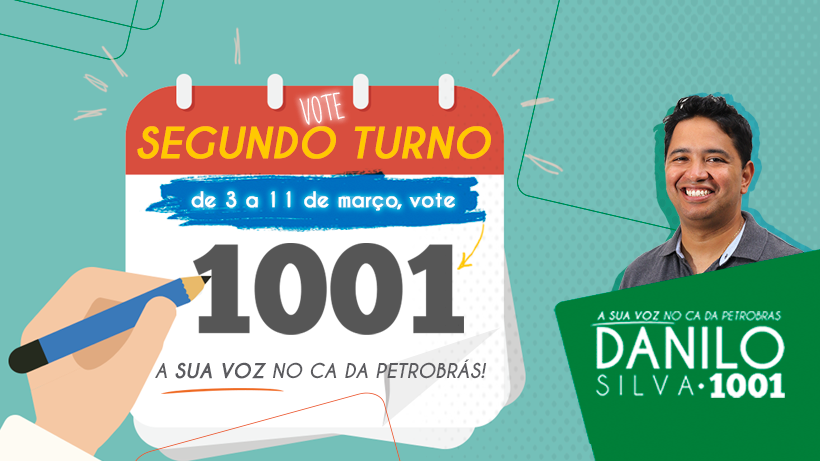 Entre os dias 03 e 11 de março, exerça seu direito de escolha e vote Danilo Silva (1001). Vamos eleger um representante que de fato represente a nossa categoria no CA da Petrobrás e, assim, fortaleça a nossa luta contra o desmonte e a privatização da empresa.