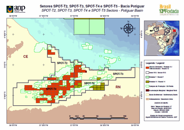 Segunda maior – Na Bacia Potiguar, serão oferecidos 71 blocos, sendo todos em terra. O número equivale a 26,7% do total da 13ª Rodada, subindo para 39%, se considerarmos apenas as bacias terrestres. É a segunda maior oferta do leilão, perdendo apenas para a Bahia (Bacia do Recôncavo), que terá 82 blocos. Mossoró, Serra do Mel, Porto do Mangue e Areia Branca são os municípios norte-rio-grandenses que conformam as áreas contempladas.