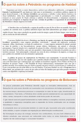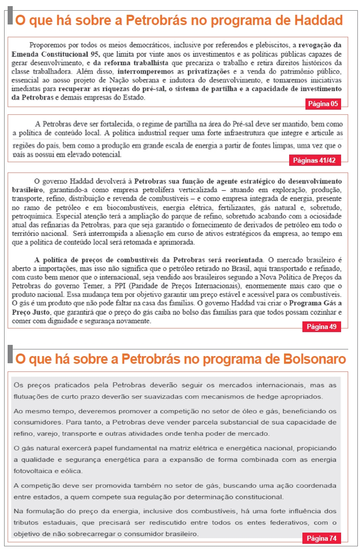 Há diferença considerável ainda entre os programas no que diz respeito ao detalhamento do que é proposto para a Petrobrás. No caso de Haddad, o programa se atém de modo mais específico, cita a recuperação do regime de partilha no pré-sal, a volta da política de conteúdo local, a reorientação na política de preços dos combustíveis, entre outros pontos. No caso de Bolsonaro, passa-se rápido pelo tema, avançando um pouco mais apenas para defender que “os preços praticados pela Petrobrás deverão seguir os mercados internacionais” e a promoção da competição no setor de gás.