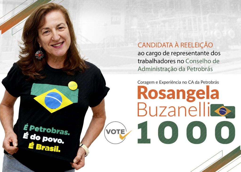 No próximo sábado, 22, começa a eleição para o novo mandato dos trabalhadores no Conselho de Administração da Petrobrás. A atual conselheira eleita, Rosangela Buzanelli (1000), disputa a reeleição com o apoio da FUP e de todos os seus sindicatos, da Aepet (Associação dos Engenheiros da Petrobras) e da Anapetro (Associação Nacional dos Petroleiros Acionistas Minoritários da Petrobras).