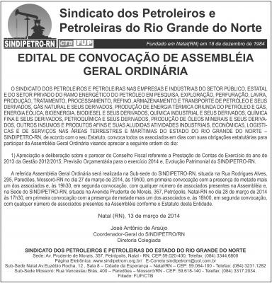 A Diretoria Colegiada do SINDIPETRO-RN está convocando a assembleia para apreciação e deliberação sobre o parecer do Conselho Fiscal referente à Prestação de Contas do Exercício do ano de 2013 da Gestão 2012/2015; Previsão Orçamentária para o exercício 2014 e, Evolução Patrimonial do SINDIPETRO-RN. As sessões serão realizadas na subsede do Sindicato em Mossoró, no dia 27 de março, às 19h00, e na sede da entidade, em Natal, no dia 28 de março, às 17h30, conforme o Edital de Convocação, publicado a seguir.