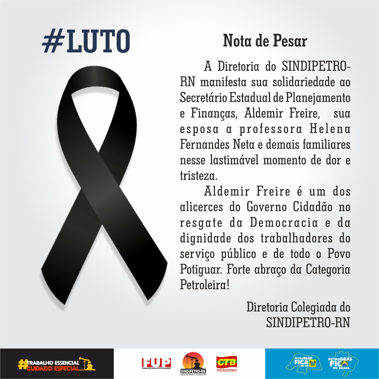 A Diretoria do SINDIPETRO-RN manifesta sua solidariedade ao Secretário Estadual de Planejamento e Finanças, Aldemir Freire, sua esposa a professora Helena Fernandes Neta e demais familiares nesse lastimável momento de dor e tristeza.