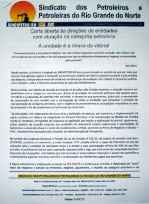 Em 31 de julho, o SINDIPETRO-RN remeteu uma “Carta Aberta às Direções de Entidades com Atuação na Categoria Petroleira”. Além da FUP e da FNP, o documento foi encaminhado para todos os sindicatos e para a Associação dos Engenheiros da Petrobrás – AEPET. Intitulada “A Unidade é a Chave da Vitória”, a Carta propõe a formação de um Comando Nacional Unificado, integrado por representações de todas as entidades atuantes na categoria petroleira.
