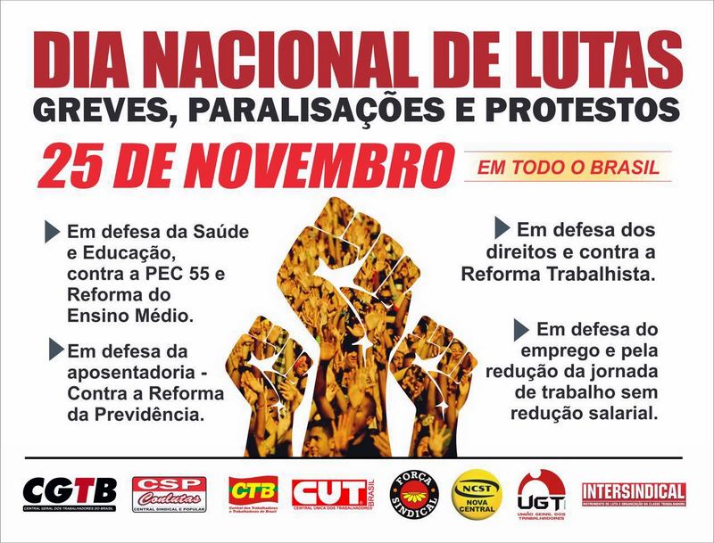A manifestação é contra as medidas antidemocráticas do governo ilegítimo de Michel Temer. O ato terá concentração às 15h em frente à Igreja Católica do bairro Alto de São Manoel, na Avenida Presidente Dutra, com percurso até o centro da cidade, onde fará o encerramento em frente ao Teatro Municipal Dix-Huit Rosado.