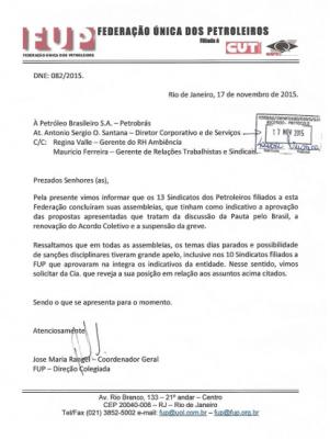 Na manhã desta terça-feira, 17, os dirigentes sindicais avaliaram o quadro nacional das assembleias, onde os trabalhadores, inclusive nas bases dos 10 sindicatos que aprovaram a proposta conquistada e suspenderam a greve, apontaram a necessidade da Petrobrás rever a sua posição em relação aos dias parados e à possibilidade de sanções disciplinares. A FUP encaminhou à empresa, no início da tarde, documento cobrando um posicionamento em relação a esses dois temas.