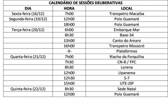 No Rio Grande do Norte, o calendário da Assembleia teve início na manhã da última sexta-feira, 16, com os trabalhadores da Transpetro (Macaíba). As sessões deliberativas prosseguem até a próxima quinta-feira, 22, reunindo todas as principais bases da Petrobrás no Estado. Veja, a seguir, o cronograma de assembleias e participe!