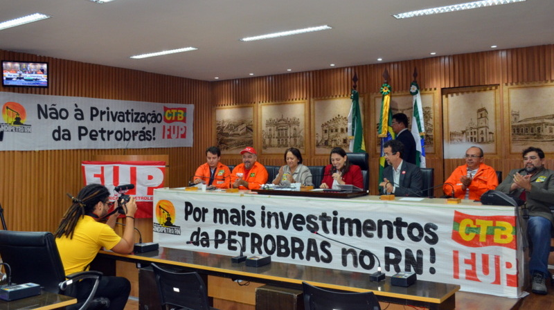 Iniciativa da vereadora Natália Bonavides (PT), a sessão contou com a participação de diretores do SINDIPETRO-RN, AGERN, AEPET, FUP e CTB, entre outras entidades. Também estiveram presentes o deputado estadual Fernando Mineiro e a senadora Fátima Bezerra, ambos do PT. A nota destoante, mais uma vez, foi a ausência de representantes da gerência local da Petrobrás e do Governo do Estado.