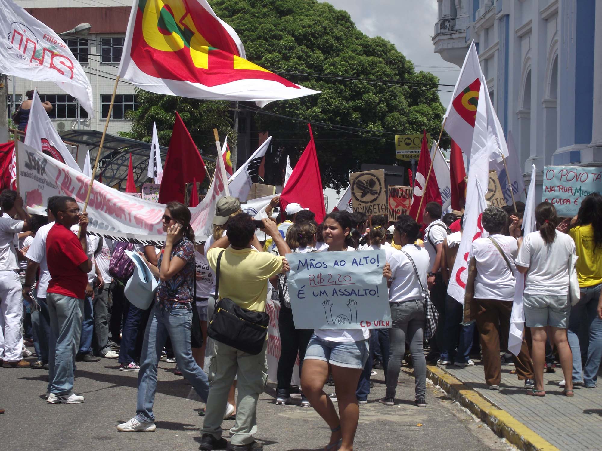 Estudantes e servidores – Enquanto o protesto dos permissionários de vans avançava pelas ruas da cidade, estudantes e servidores municipais já se encontravam em frente à sede da Prefeitura. O recente aumento no preço da passagem de ônibus, que passou a custar R$2,20 e a demissão de servidores da Ativa eram as principais reivindicações desse grupo, que logo teve a adesão de professores em greve e de trabalhadores da saúde. Às 11 horas, quando as vans chegaram à frente do Palácio Felipe Camarão, os protestos se avolumaram, e os manifestantes se dirigiram até o cruzamento de duas das principais artérias do centro da cidade (esquina da Ulisses Caldas com Rio Branco), interrompendo o trânsito por mais de uma hora.
