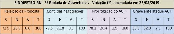 Com mais de 72% de rejeição acumulada, a terceira contraproposta de Acordo Coletivo de Trabalho apresentada pela Petrobrás continua sendo rechaçada pela categoria petroleira norte-rio-grandense. Nesta quinta-feira, 22, manifestaram-se os trabalhadores das bases do ET-B, ET-A, S-7 e da Usina Termelétrica Jesus Soares Pereira (UTE-JSP).