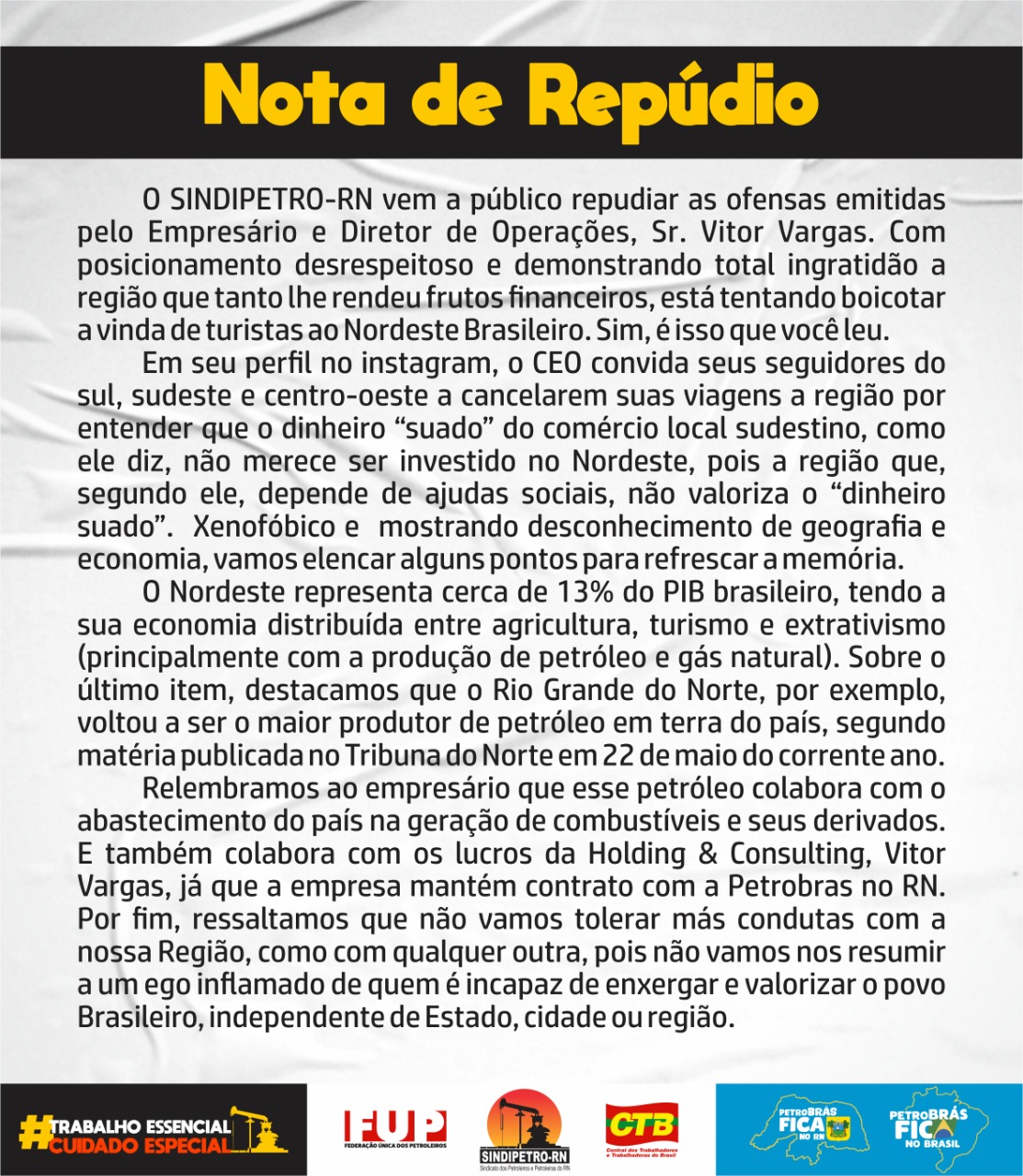 O SINDIPETRO-RN vem a público repudiar as ofensas emitidas pelo Empresário e Diretor de Operações, Sr. Vitor Vargas. Com posicionamento desrespeitoso e demonstrando total ingratidão a região que tanto lhe rendeu frutos financeiros, está tentando boicotar a vinda de turistas ao Nordeste Brasileiro. Sim, é isso que você leu. Em seu perfil no instagram, o CEO convida seus seguidores do sul, sudeste e centro-oeste a cancelarem suas viagens a região por entender que o dinheiro “suado” do comércio local sudestino, como ele diz, não merece ser investido no Nordeste, pois a região que, segundo ele, depende de ajudas sociais, não valoriza o “dinheiro suado”. Xenofóbico e mostrando desconhecimento de geografia e economia, vamos elencar alguns pontos para refrescar a memória.