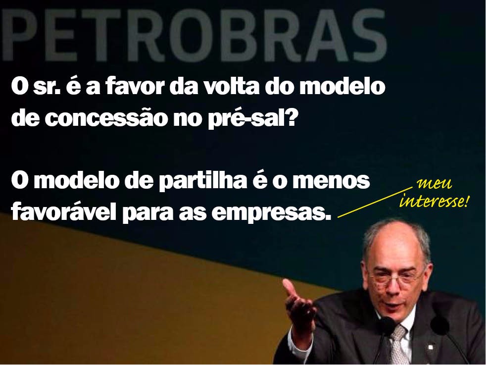 Pedro Parente sabe muito bem que seu papel não é defender os interesses estratégicos da Petrobrás, como disse na entrevista. Sua função é preparar a companhia para atender aos interesses econômicos dos setores que apoiaram o golpe. Por isso é contra a Petrobrás ser a operadora do Pré-Sal. Na entrevista à Folha, ele chegou a afirmar que o modelo de partilha é “o menos favorável para as empresas”. Como assim? Quem Pedro Parente representa? A Petrobrás ou as suas concorrentes? Um gestor que abre mão de 30% de participação garantida nos campos do Pré-Sal definitivamente não tem qualquer compromisso com os interesses estratégicos da empresa que comanda.