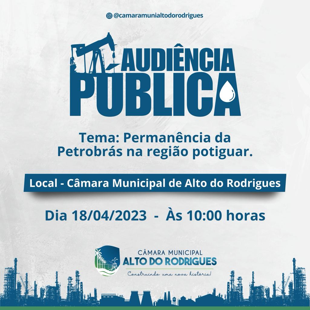 A Diretoria do SINDIPETRO-RN conclama trabalhadores, sindicatos, movimentos sociais e a classe política estadual para participar da audiência pública convocada pela Câmara Municipal do Alto do Rodrigues nesta terça(18/04), que tem objetivo de debater a permanência da Petrobras no RN. A sessão parlamentar terá inicio às 10 horas no plenário da Câmara(Rua São Joao, 107, centro).