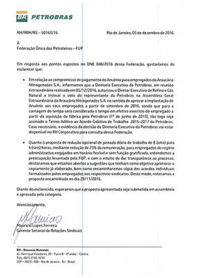 Naquela ocasião, em consequência das decisões aprovadas pelo Conselho Deliberativo da FUP, as entidades sindicais remeteram comunicado à Petrobrás informando que o respeito ao ACT é condição para negociar. Assim, qualquer proposta de Aditivo apresentada pela empresa só seria submetida à categoria após o atendimento de duas demandas: aprovação, sem condicionantes, do acordo de implementação do ATS da Fafen-PR, e remessa da proposição de redução da jornada com redução de salários para a Comissão de Regimes.
