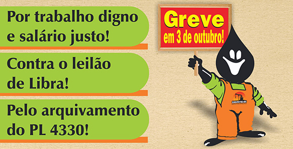 Greve – Para cobrar da Petrobrás o fim da embromação e a imediata apresentação de uma contraproposta decente, a categoria petroleira prepara uma greve de 24 horas, a ser realizada no dia 3 de outubro, data em que a Companhia completará 60 anos de existência. O movimento também pede o cancelamento do leilão de Libra, previsto para 21 de outubro, e o arquivamento do PL 4330, que escancara a terceirização.