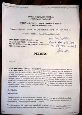 Ao invés de abrir a discussão em torno das questões levantadas pelos trabalhadores em greve, a Petrobrás, mais uma vez, prefere intimidar a categoria. Desta feita, amparada por um interdito proibitório concedido por um Juiz do Trabalho. A decisão foi comunicada à Direção do SINDIPETRO-RN no final da manhã desta quinta-feira, 5, e atenta contra o direito de greve e a organização sindical, repetindo uma fórmula utilizada no passado: a imposição de pesadas multas diárias às entidades sindicais.