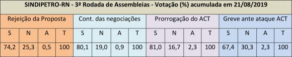 o segundo dia da rodada de assembleias deliberativas destinadas a apreciar a terceira contraproposta de Acordo Coletivo de Trabalho – ACT – apresentada pela Petrobrás, a categoria petroleira norte-rio-grandense ampliou os índices de rejeição.