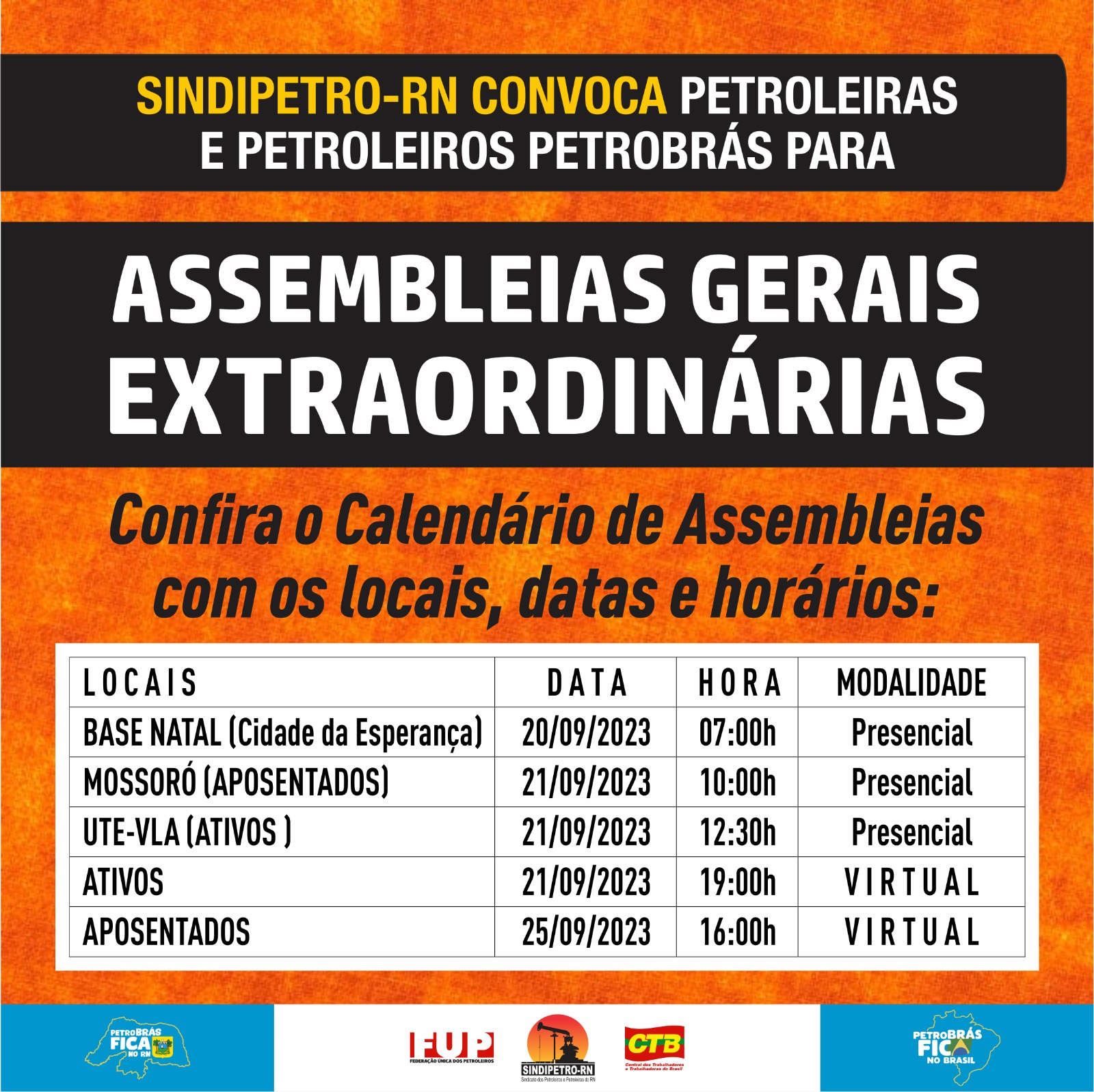 As sessões presenciais estão acontecendo na Base Administrativa da Petrobras em Natal; na Usina Termelétrica do Vale do Açu Jesus Soares Pereira (UTE JSP), mais conhecida como Termoaçu; e na subsede Mossoró(Rua Venceslau Bras, 400 Paredões), conforme o calendário abaixo. Nos dias 21 e 25 serão realizadas assembleias virtuais com petroleiros da ativa e aposentados, respectivamente.