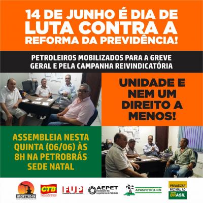 Como forma de demonstrar a insatisfação com a proposta de ACT da Petrobrás, refirmando a bandeira de “Nem um direito a menos!”, e, ao mesmo tempo, para reforçar a luta unitária da classe trabalhadora brasileira contra a reforma da Previdência, os petroleiros e petroleiras norte-rio-grandenses também estão aprovando a adesão à greve geral de 14 de junho.