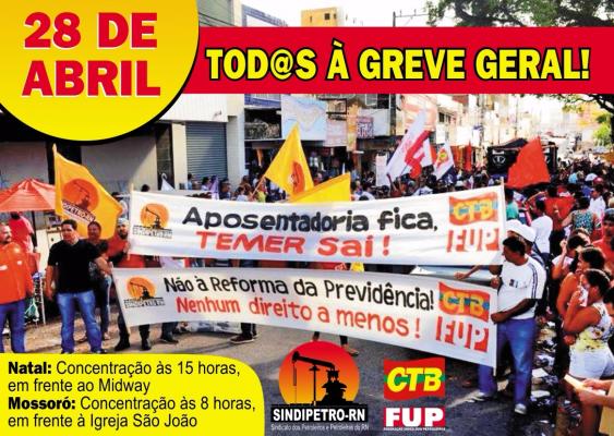 Em Natal, a concentração dos trabalhadores e do povo contra as reformas neoliberais impostas pelo governo golpista de Michel Temer será realizada a partir das 15 horas, na avenida senador Salgado Filho, em frente ao IFRN / Midway. Em Mossoró, serão realizadas duas mobilizações. Pela manhã, o encontro acontece às 8 horas, em frente à Igreja São João, com caminhada até a Praça da Catedral. No período da tarde, a concentração está marcada às 15 horas, em frente à Igreja do Alto de São Manoel. Em seguida, os manifestantes deslocam-se até a Praça do Pax, no centro da cidade.