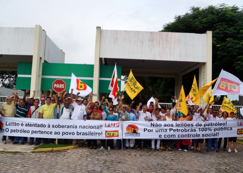 Suspensão dos leilões de petróleo e rechaço ao PL4330 que, a pretexto de regulamentar a terceirização, precariza ainda mais as relações de trabalho no Brasil. Estas foram as principais bandeiras levantadas pelos trabalhadores petroleiros, durante o ato público realizado na manhã desta quinta-feira, 11 de julho, em frente ao portão principal de acesso à sede administrativa da Petrobrás, em Natal. O movimento teve início às 5h00, e ocorreu paralelamente a diversas outras manifestações, realizadas em vários pontos da cidade, como parte do Dia Nacional de Luta.