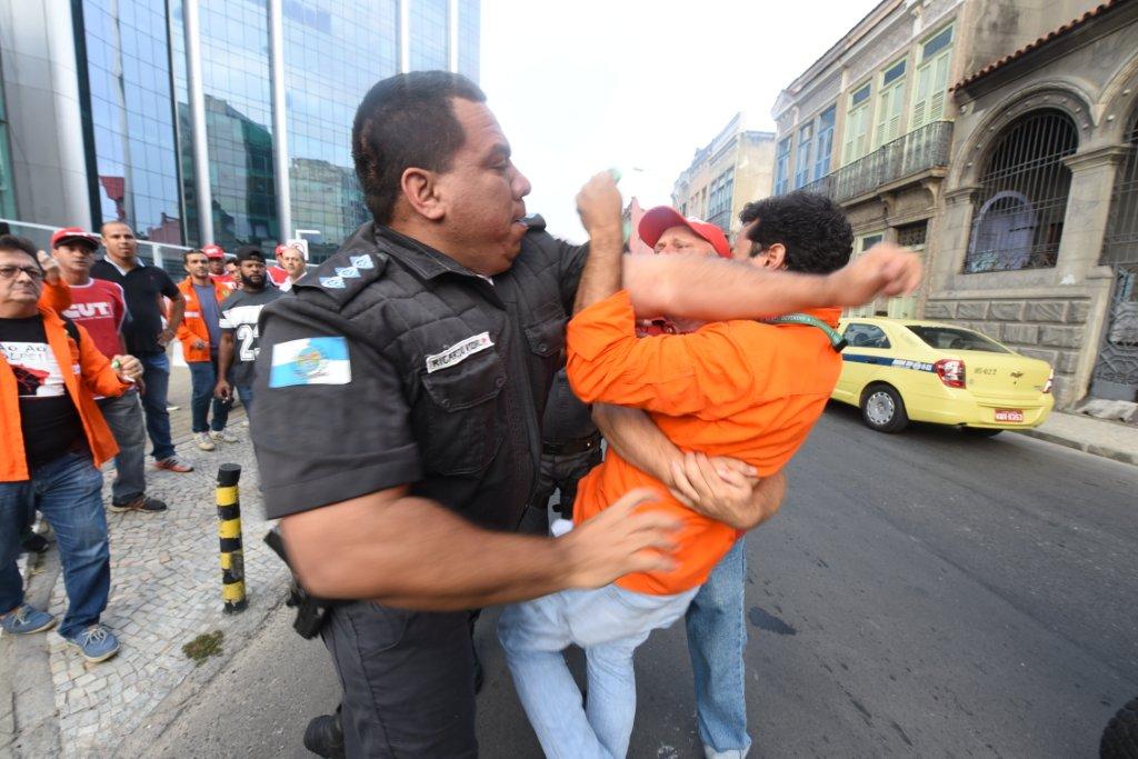 Um ato pacífico, organizado pela FUP, FNP e sindicatos filiados, em frente ao prédio Senado da Petrobrás, no Rio de Janeiro, na manhã desta terça-feira, 8, foi interrompido pela ação truculenta da Polícia Militar. A tropa chegou ao local causando tumulto e agredindo os sindicalistas e trabalhadores da Petrobrás que protestavam contra a venda de ativos dos campos terrestres, o desmonte e a privatização do Sistema Petrobrás (veja vídeo postado no Facebook).