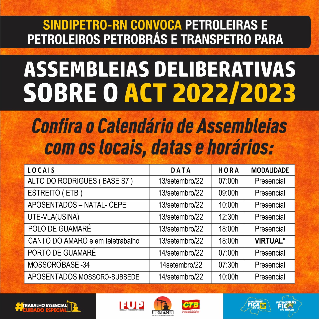 Petroleiros da ativa e aposentados do RN seguem aprovando por ampla maioria a quarta contraproposta de Acordo Coletivo de Trabalho – 2022/2023 da Petrobrás e Transpetro. As assembleias estão sendo realizadas hoje e amanhã, 14, de forma presencial e virtual nas áreas operacionais e administrativas da Estatal no território potiguar.