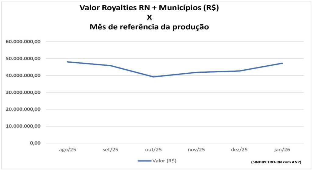 Nos meses de janeiro, fevereiro e março de 2026, a arrecadação de royalties repassada ao Estado e aos municípios do Rio Grande do Norte apresentou leve crescimento em relação aos valores transferidos em dezembro de 2025. Isso ocorreu mesmo em meio à queda recorde da produção potiguar de petróleo e gás, que atingiu, em janeiro de 2026, o menor nível dos últimos 40 anos. Os valores pagos nos três primeiros meses do ano referem-se, respectivamente, à produção realizada em novembro e dezembro de 2025 e janeiro de 2026, conforme ilustrado no gráfico a seguir.
