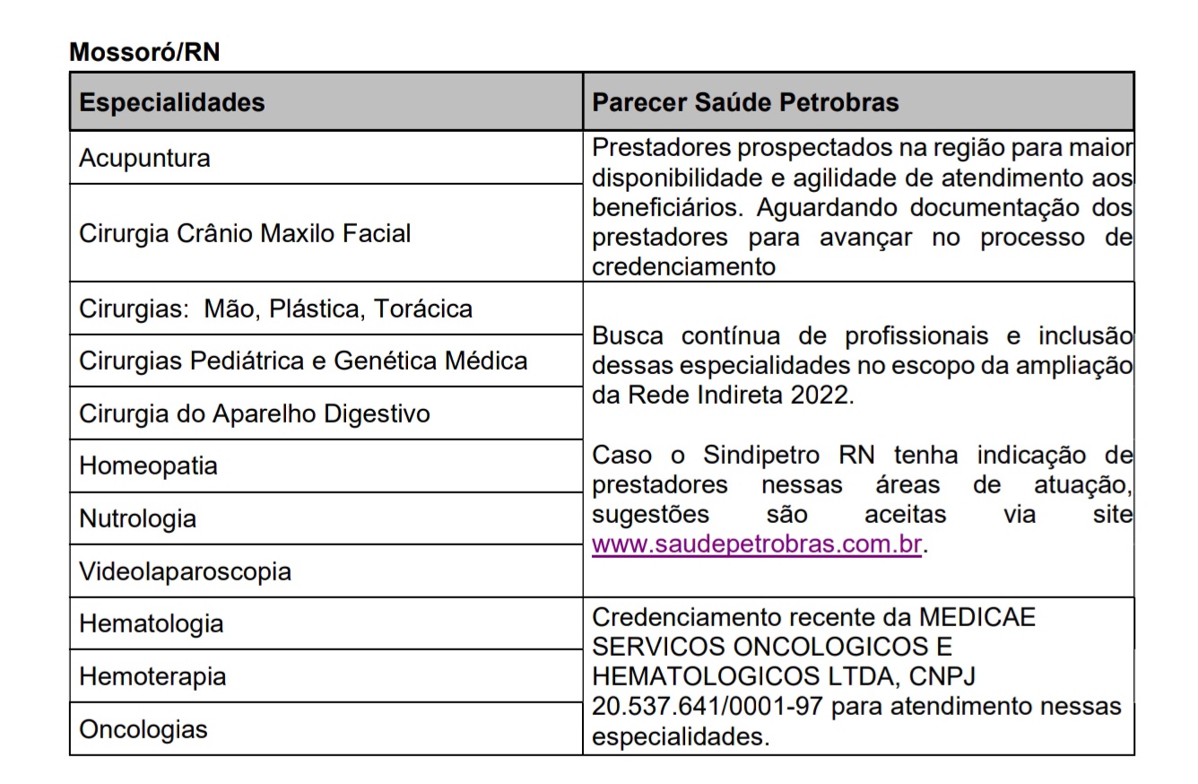 Ainda no comunicado, a empresa apresenta dois quadros com parecer sobre cada especialidade questionada pelo sindicato nas cidades de Natal e Mossoró: