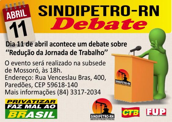 O segundo tema a ser discutido no “SINDIPETRO-RN Debate”, será a Redução na Jornada de Trabalho. O projeto, que prevê 4 temas, é realizado pelos diretores e acontece sempre nas terças-feiras, às 18h30, na subsede da entidade em Mossoró, visando dialogar com petroleiros e petroleiras as possíveis alterações no ACT e levar os encaminhamentos como proposta para negociações com gestão da Petrobrás.