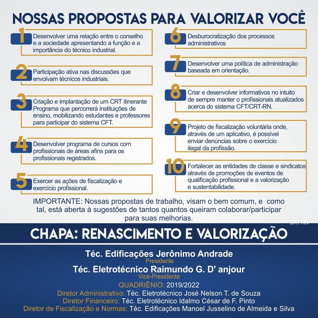 Confira as principais propostas da chapa “Renascimento e Valorização” (clique na imagem abaixo para ampliá-la):