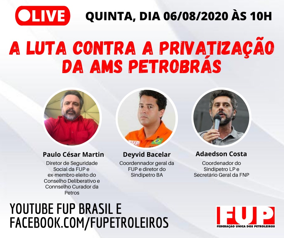 Para trazer mais esclarecimentos e sobre as formas de luta que teremos que fazer contra a privatização da AMS e a implantação dessa associação, um programa uma importante vai tratar desse tema essa semana, com a participação de convidados como, Deyvid Bacelar (coordenador da FUP e diretor do Sindipetro Bahia) e Adaedson Costa (Secretário Geral da FNP e Coordenador do Sindipetro Litoral Paulista).