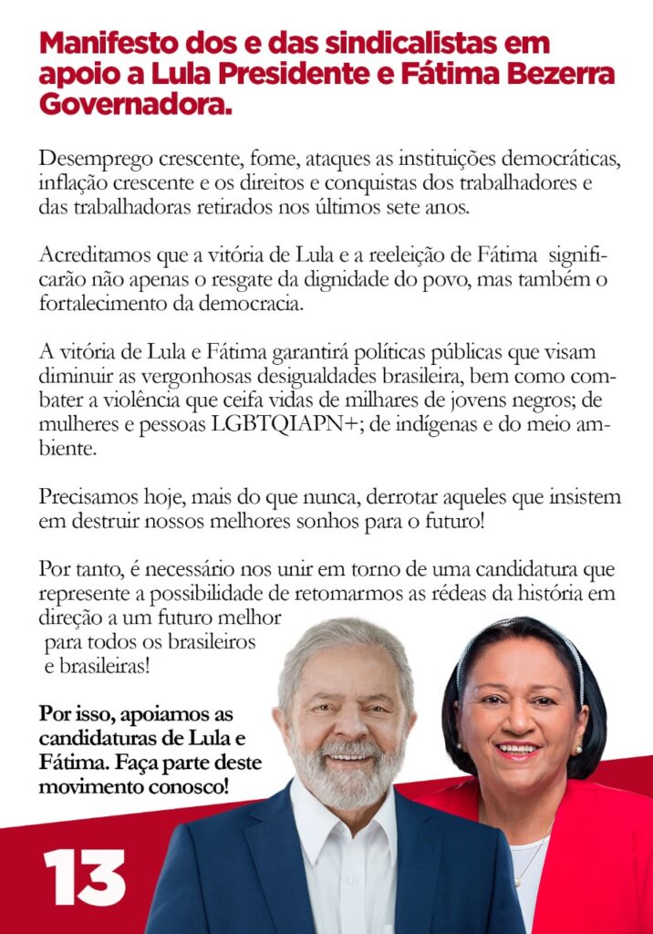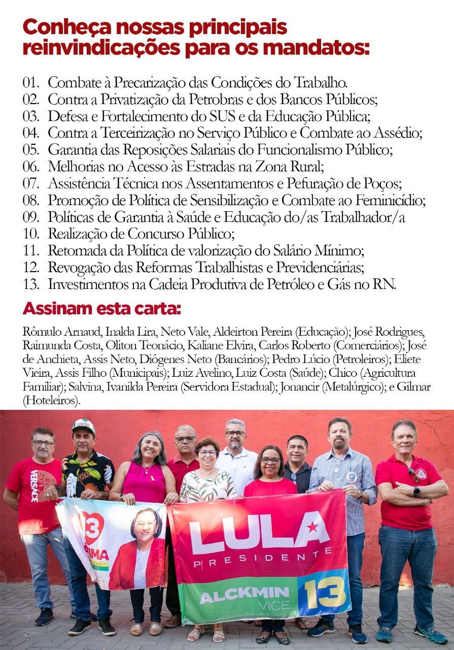 A governadora e candidata à reeleição, Fátima Bezerra e o candidato ao senado, Carlos Eduardo, acolheram as demandas dos sindicalistas e se comprometeram em lutar junto com Lula para concretizar todos os pontos apresentados no manifesto.
