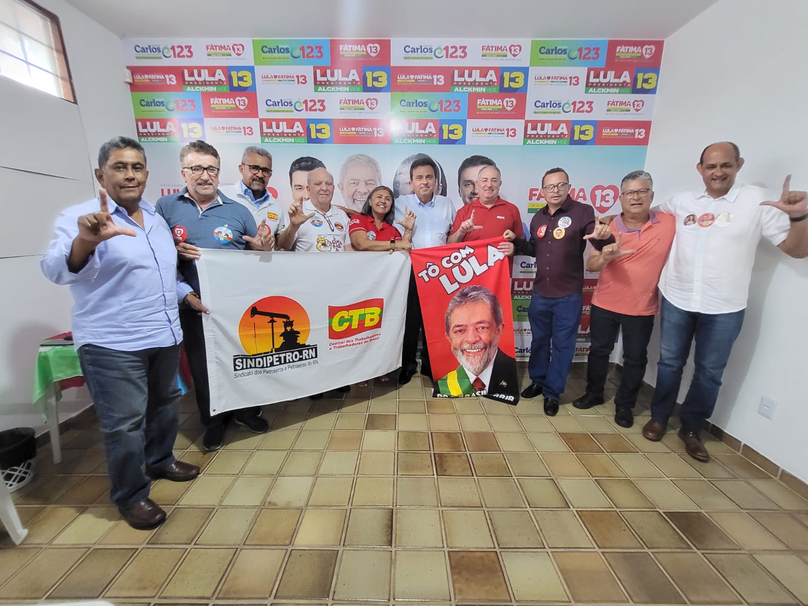 Contra o desemprego, fome, ataques a democracia e aos direitos da classe trabalhadora, sindicalistas do RN ratificam o apoio às candidaturas de Lula, Fátima e Carlos Eduardo nas eleições 2022. O ato foi realizado na quinta, 8, no comitê eleitoral da governadora em Natal. Na oportunidade os dirigentes sindicais entregaram um manifesto com treze reivindicações para os mandatos.