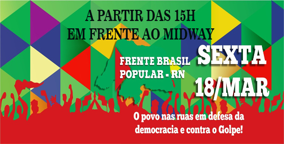 O SINDIPETRO-RN juntamente com as entidades que compõem a Frente Brasil Popular, conclama a categoria petroleira a participar do Ato em Defesa da Democracia e contra o estado de exceção, imposto pelo juiz Moro, que ocupará nas ruas e praças de todo o país hoje, dia 18 de março. Em Natal, a atividade terá início às 15 horas, com concentração em frente ao Midway, localizado na Avenida Salgado Filho. O movimento sairá às 17 horas em passeata até a Praça da Árvore de Mirassol, onde será realizado um Ato Público, encerrando a manifestação.