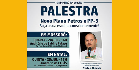 A Diretoria Colegiada do SINDIPETRO-RN convida trabalhadores e trabalhadoras da Petrobrás, ativos e aposentados, para uma palestra sobre o novo Plano PETROS. O evento será realizado na próxima quarta-feira, 24, em Mossoró, e quinta-feira, 25, em Natal, contando com a presença do conselheiro deliberativo da Petros, eleito pelos trabalhadores, Norton Almeida.