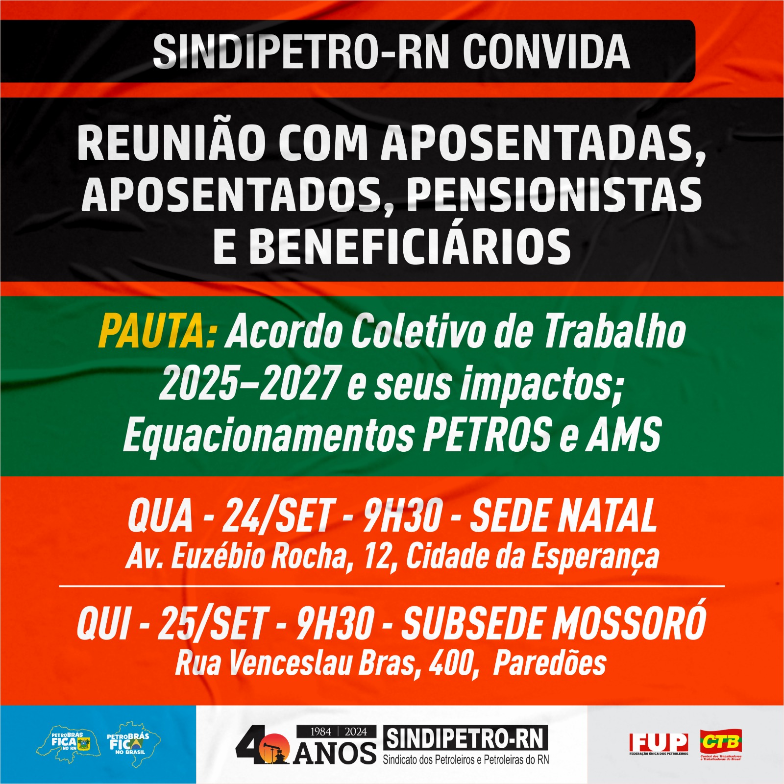 O SINDIPETRO-RN realizará duas reuniões presenciais para tratar do Acordo Coletivo de Trabalho 2025–2027 e seus impactos para aposentadas/os, pensionistas e beneficiários.