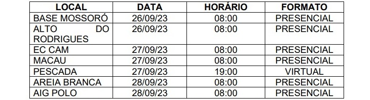 A diretoria do SINDIPETRO-RN conclama petroleiros e petroleiras da 3R Petroleum para participar das assembleias deliberativas com objetivo de debater sobre a contraproposta do Acordo Coletivo de Trabalho – 2023/2024 e outros assuntos de interesse da categoria. As sessões serão realizadas de 26 a 28 de setembro, na modalidade presencial e virtual, conforme Edital de Convocação.