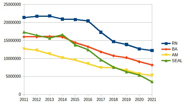 A partir de 2016 a estatal vem realizando esse plano, e a produção do nosso Estado passou a cair drasticamente desde então. Como mostra o gráfico abaixo, gerado a partir dos dados da produção entre 2011 e 2021, divulgados pela Agência Nacional do Petróleo, Gás Natural e Biocombustíveis – ANP, que faz um comparativo entre os diversos estados produtores: