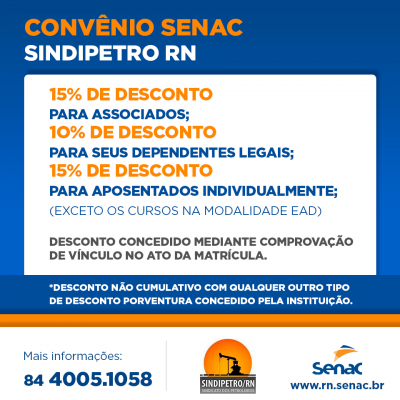 A partir de agora, trabalhadores sindicalizados da ativa, aposentados ou pensionistas, além de seus dependentes e de empregados do SINDIPETRO-RN, poderão obter descontos em cursos oferecidos pelo Senac RN.