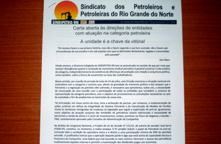 Veja,aqui, na íntegra, a Carta Aberta do SINDIPETRO-RN dirigida às direções de entidades com atuação na categoria petroleira!