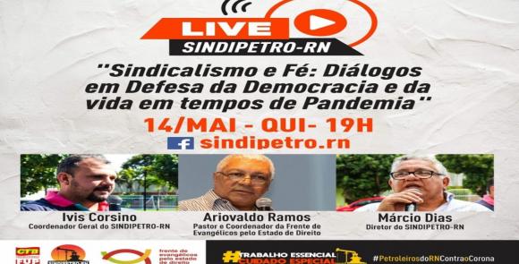 Nesta quinta-feira, 14/05, a diretoria do Sindipetro-RN fará uma live com o tema, “Sindicalismo e Fé: Diálogos em Defesa da Democracia e da vida em tempos de Pandemia”. A transmissão será às 19h na página do sindicato no Facebook.