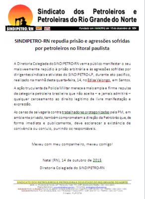 A Diretoria Colegiada do SINDIPETRO-RN vem a público manifestar o seu mais veemente repúdio à prisão arbitrária e às agressões sofridas por dirigentes sindicais e ativistas do SINDIPETRO-LP, durante ato pacífico, realizado na manhã desta quarta-feira, 14, no Edisa Valongo, em Santos.